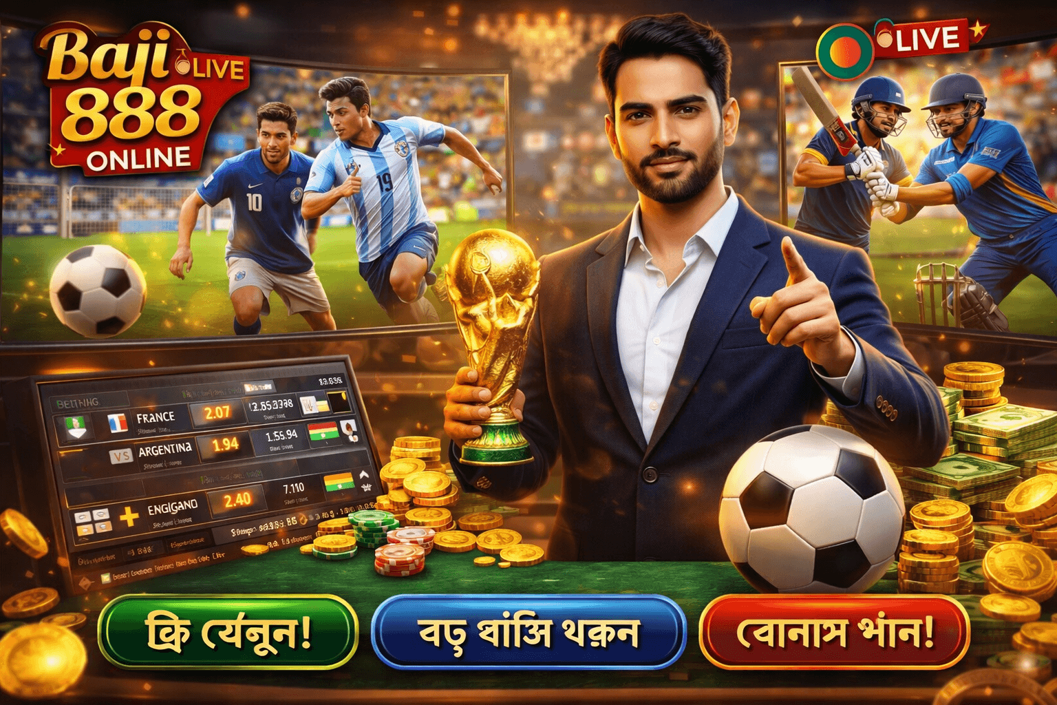 ক্রিকেট বাংলাদেশের জাতীয় খেলা এবং আমরা এই খেলাকে বিশেষ গুরুত্ব দিই। Baji 888 Live তে আপনি বাংলাদেশ জাতীয় দলের সকল ম্যাচ, IPL, BPL, PSL, The Ashes সহ বিশ্বের সকল প্রধান ক্রিকেট টুর্নামেন্টে বেটিং করতে পারবেন।